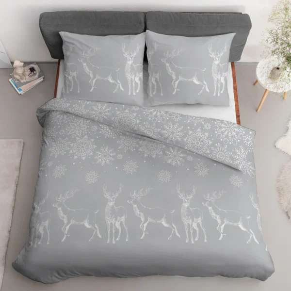 Komplety szarej pościeli z reniferami dostępne również w pośrednim, komfortowym rozmiarze 180x200 cm z poszewkami 50x60 lub 70x80 cm.