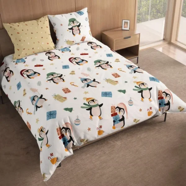 Bawełniany komplet pościeli z pingwinami zwierzątkami z koła podbiegunowego. Słodki wzór pościeli w biało-beżowej kolorystyce, przeznaczony dla dzieci ze świątecznym motywem pingwinków. Zestawy pościeli z pingwinami w fantazyjnych zimowych czapkach z rekwizytami nawiązującymi do bożonarodzeniowych tradycji, czyli prezentami, choinkami, bombkami i gwiazdkami. Rewers poszwy i poszewki w beżowej kolorystyce z drobnymi gwiazdkami i choinkami