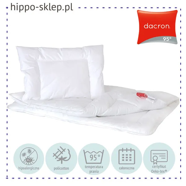 Hipoalergiczna kołdra + poduszka do łóżeczek dla dzieci Dacron 95. Zestaw przeznaczony dla maluchów z silną alergią kontaktową, AZS, i wszędzie tam, gdzie wymagana jest bardzo częsta konserwacja kołdry i poduszki w wysokich temperaturach. Dzięki zastosowaniu wzmacnianych, odpornych na działanie wysokich temperatur włókien możliwe jest pranie kompletów w temperaturze do 95°C. Całoroczne zestawy kołdra i poduszka dla alergika Dacron® 95 dostępne w dwóch rozmiarach: Kołdra + poduszka Dacron dla niemowlaków 90x120 + 40x60 cm przeznaczona do łóżeczek dziecięcych 120x60 lub 70x120 oraz komplety 100x135 + 40x60 cm do większych łóżeczek z materacem 70x140 cm, lub większych. Całoroczne komplety kołdra + poduszka Dacron z poszyciem z wytrzymałego policottonu (50% bawełna / 50% poliester) w kolorze białym, wypełnienie Advansa Dacron® 95 °C. Najwyższej jakości surowce użyte do produkcji zestawów Dacron, certyfikowane według Oeko-Tex standard 100 w klasie I wolne od substancji szkodliwych i alergizujących. Producent Poldaun, model Zestaw poduszka i kołderka Dacron całoroczny.