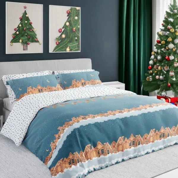 Komplet pościel z piernikową wioską to fantastyczny pomysł na zmianę wystroju sypialni na okres zimy oraz świąt Bożego Narodzenia.